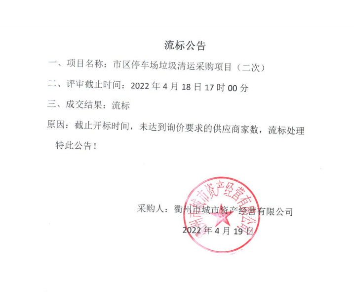 市區(qū)停車(chē)場(chǎng)垃圾清運(yùn)采購(gòu)項(xiàng)目(二次)流標(biāo)公告