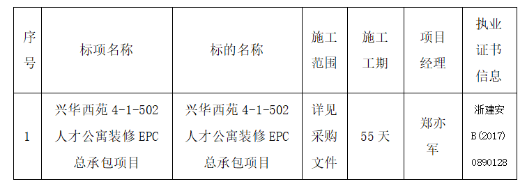 衢州市城投工程咨詢有限公司關(guān)于興華西苑4-1-502人才公寓裝修EPC總承包項目的成交結(jié)果公告(非政府采購項目)