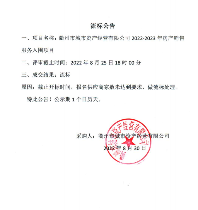 衢州市城市資產(chǎn)經(jīng)營(yíng)有限公司2022-2023年房產(chǎn)銷售服務(wù)入圍項(xiàng)目流標(biāo)公告