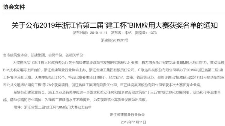 11月11日,浙江省建筑行業(yè)協(xié)會公布了2019年浙江省第二屆“建工杯”BIM應用大賽獲獎名單,四省邊際中心醫(yī)院項目獲工民建組別一等獎。本次大賽由浙江省建筑業(yè)行業(yè)協(xié)會主辦,浙江省建工集團有限責任公司、廣聯(lián)達科技股份有限公司承辦。大賽自4月發(fā)布通知以來,審核通過184個項目,最終有33個項目進入決賽,工民建綜合組18個,市政機電組15個。