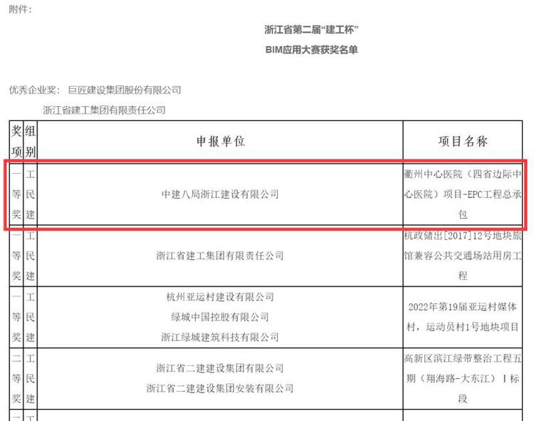 喜報! | 四省邊際中心醫(yī)院項目獲2019年浙江省第二屆“建工杯”BIM應用大賽工民建組別一等獎