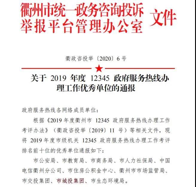 3月16日,衢州市統(tǒng)一政務(wù)咨詢投訴舉報平臺管理辦公室發(fā)布《關(guān)于2019年度衢州市政府服務(wù)熱線辦理工作優(yōu)秀單位的通報》,市城投集團(tuán)榮獲“2019年度12345政府服務(wù)熱線辦理工作優(yōu)秀單位”。