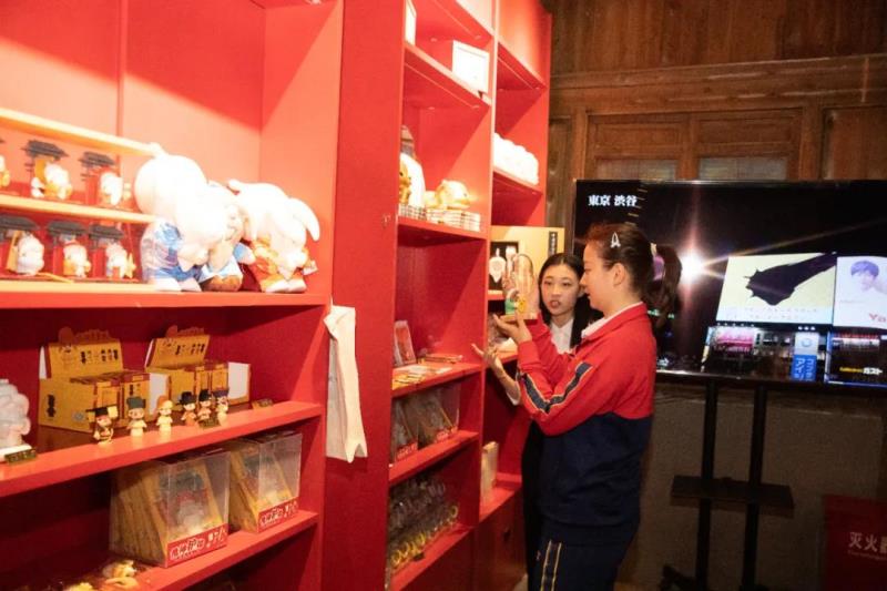 展柜上,布置滿著快樂小鹿吉祥物和南孔爺爺衢州城市卡通形象。小到書簽、靠枕,大到城市宣傳圖,都滲透著濃厚的傳統(tǒng)文化氣息。